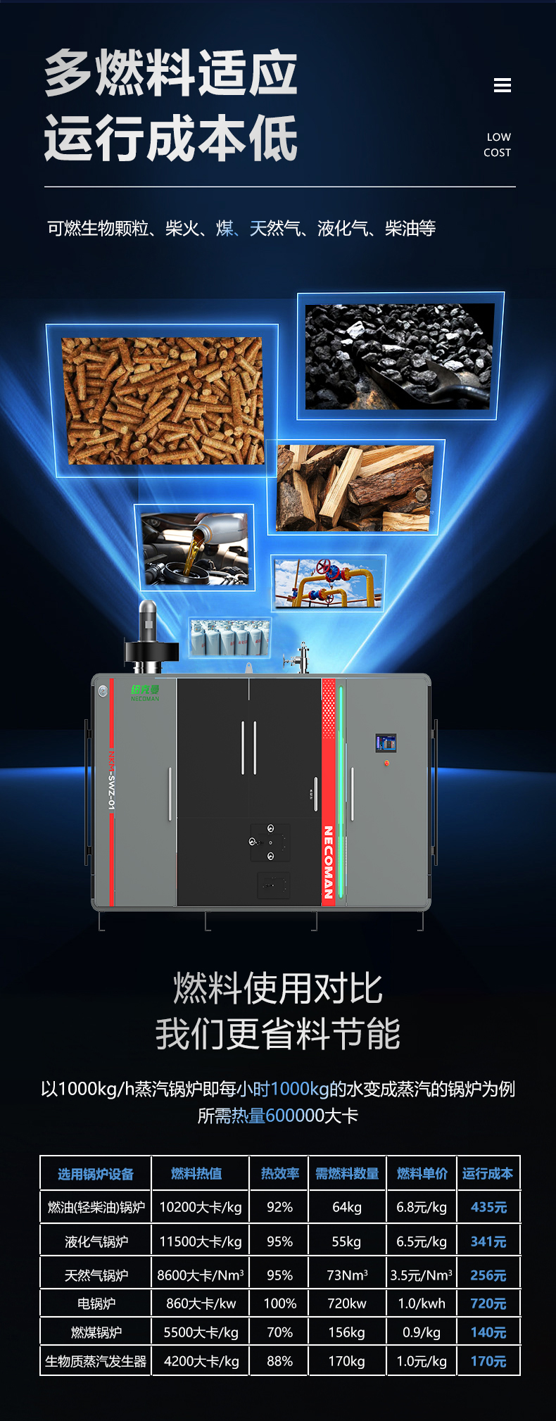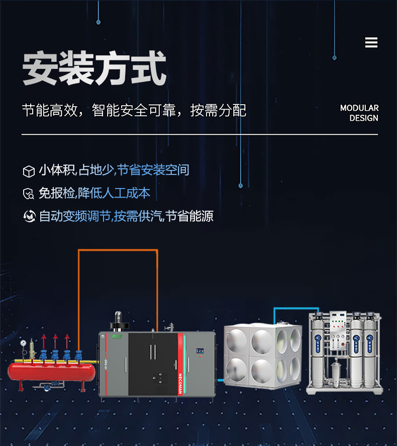 蒸汽量:6kg至6T;适用燃料:天然气、油、生物颗粒;几何容积<30L,免监检;大炉门设计,可燃木块等木质燃料,排烟温度低、搭配多回程蛇形设计,寿命长,自主研发预制板结构,节省燃料;温度、压力、可定制,更多参数可致电15323300918...