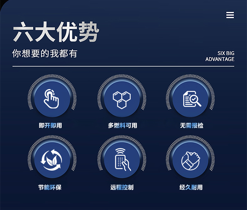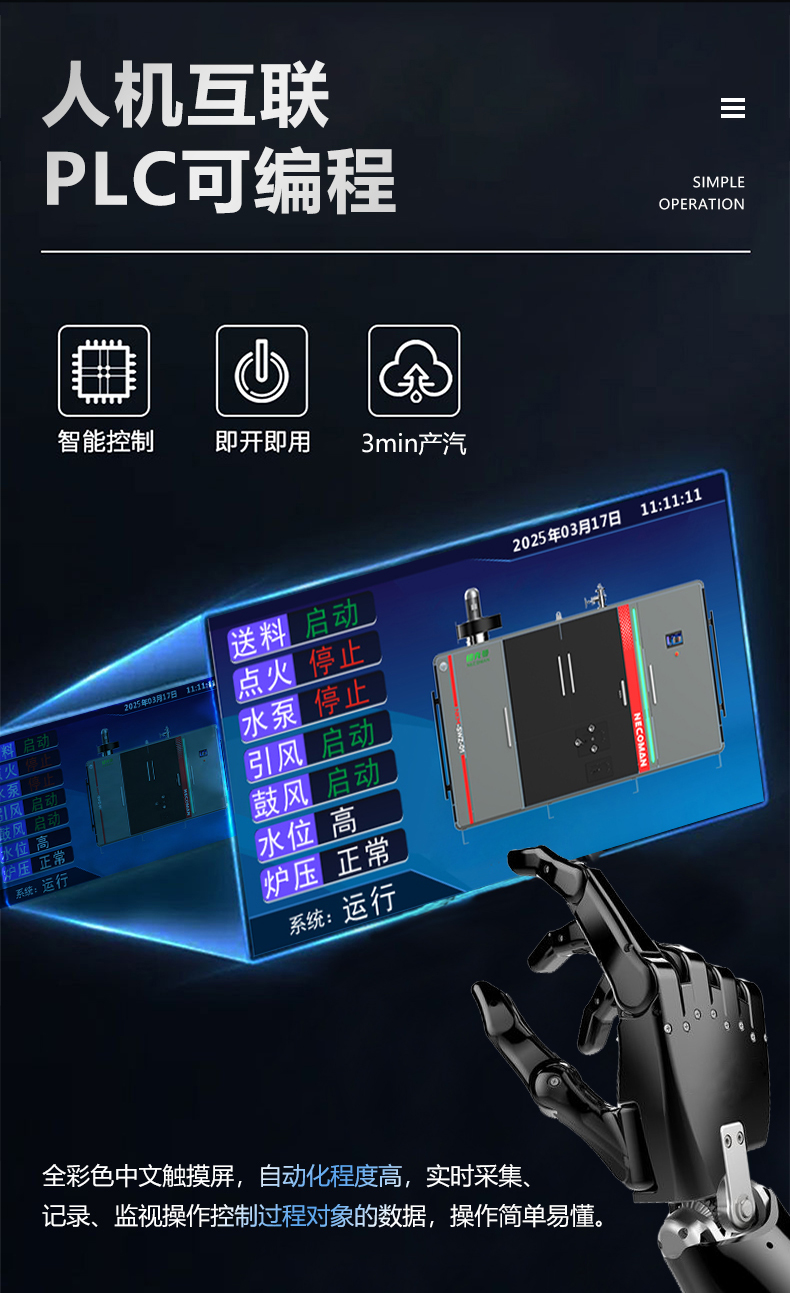 蒸汽量:6kg至6T;适用燃料:天然气、油、生物颗粒;几何容积<30L,免监检;大炉门设计,可燃木块等木质燃料,排烟温度低、搭配多回程蛇形设计,寿命长,自主研发预制板结构,节省燃料;温度、压力、可定制,更多参数可致电15323300918...